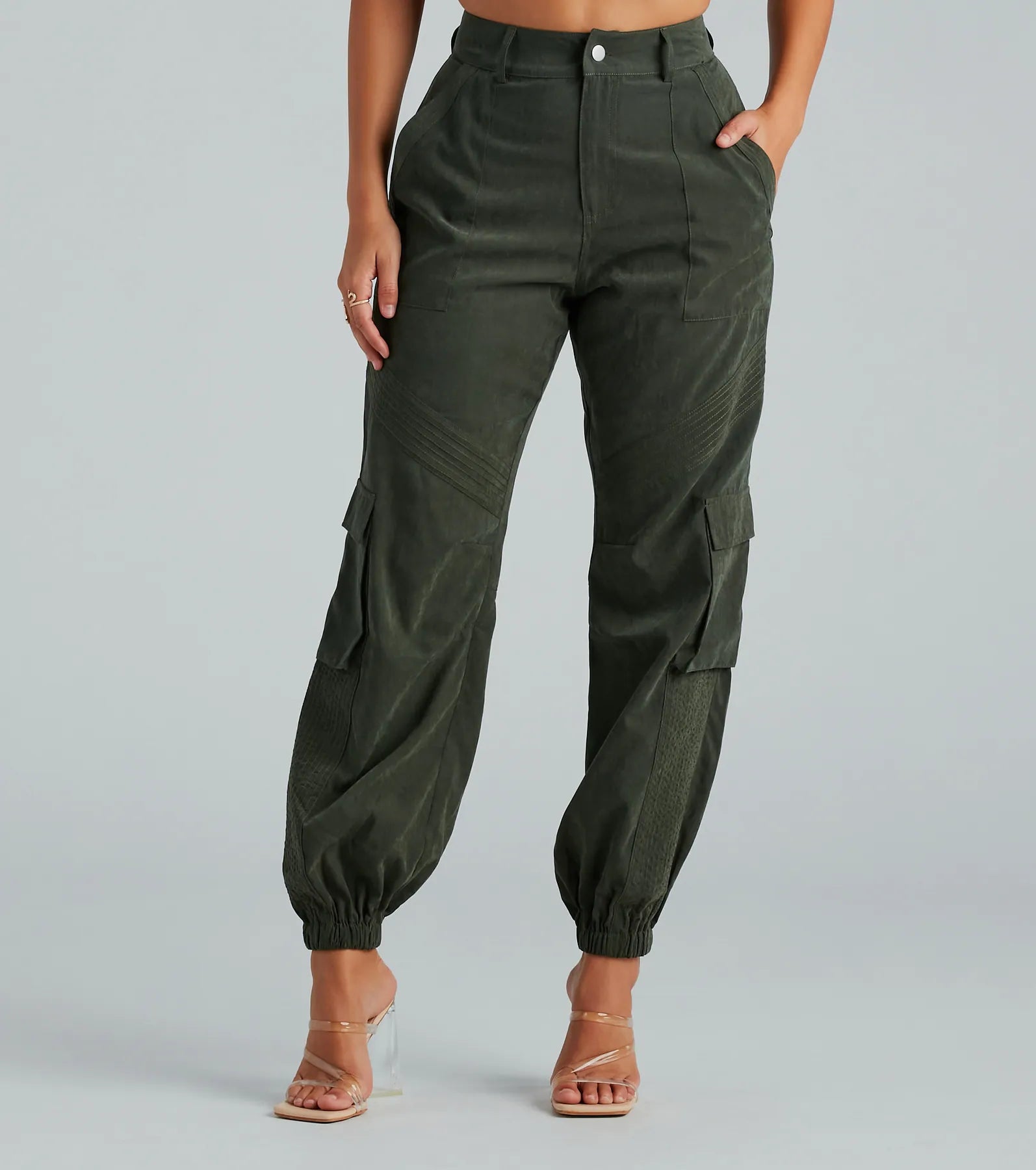 These?high-rise cargo joggers will have you looking like a fashionista no matter where you go! The pants feature a slim silhouette, pleated striped panels, side pockets, and cargo-style pockets, and elasticized cuffs, you'll be stylishly equipped to take on the world. Plus, they're crafted from a brushed twill woven fabric, so you'll be comfy and cozy like a boss! Style the joggers with a crop top for daytime plans!