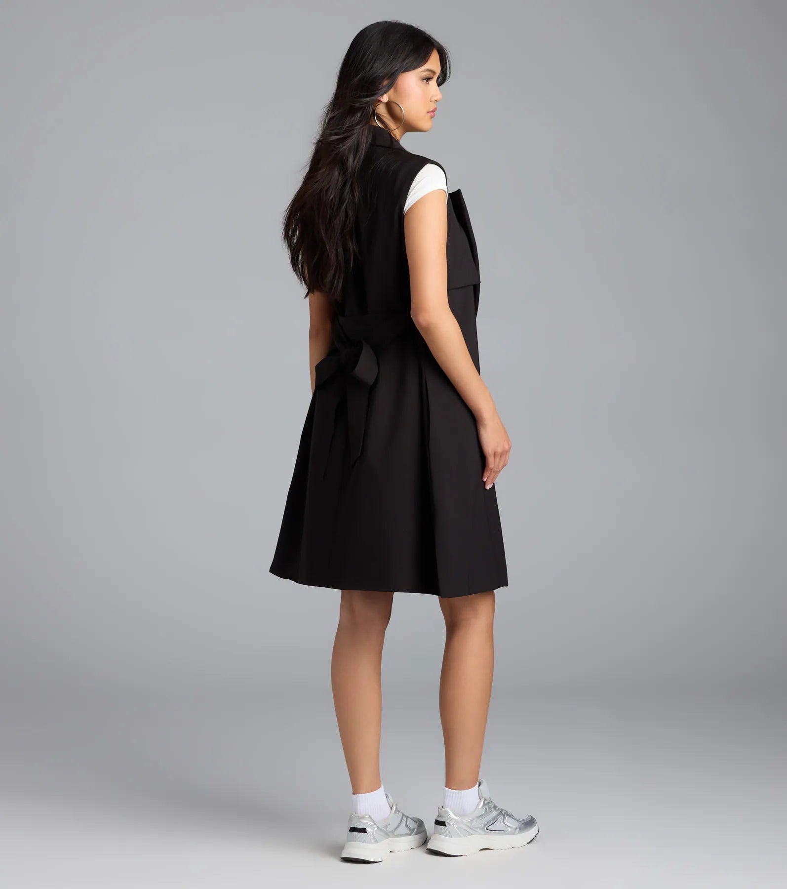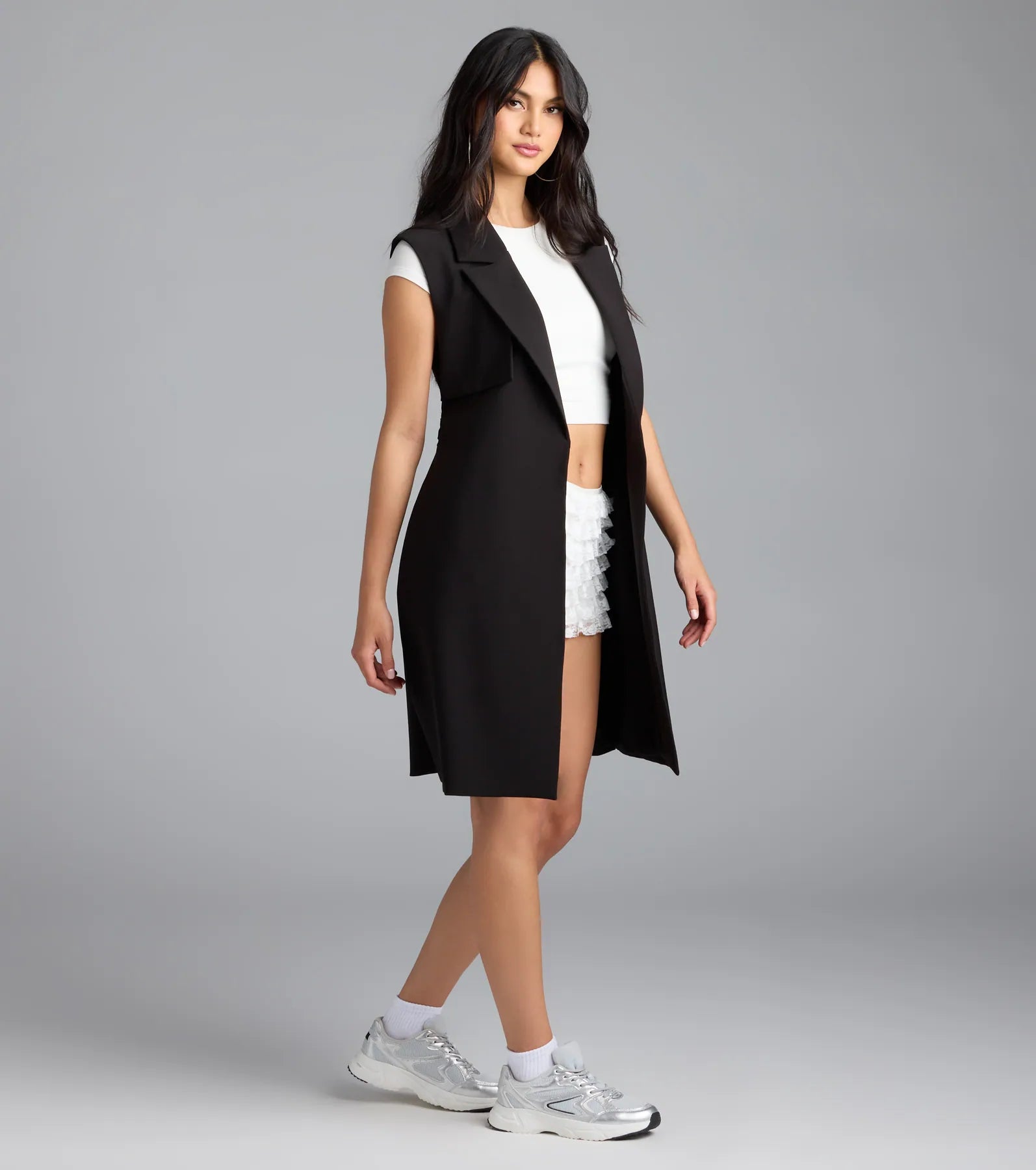 Layer on chic with this sleeveless long vest! It features a lapel collar neckline, belted waist, and convenient side pockets.
