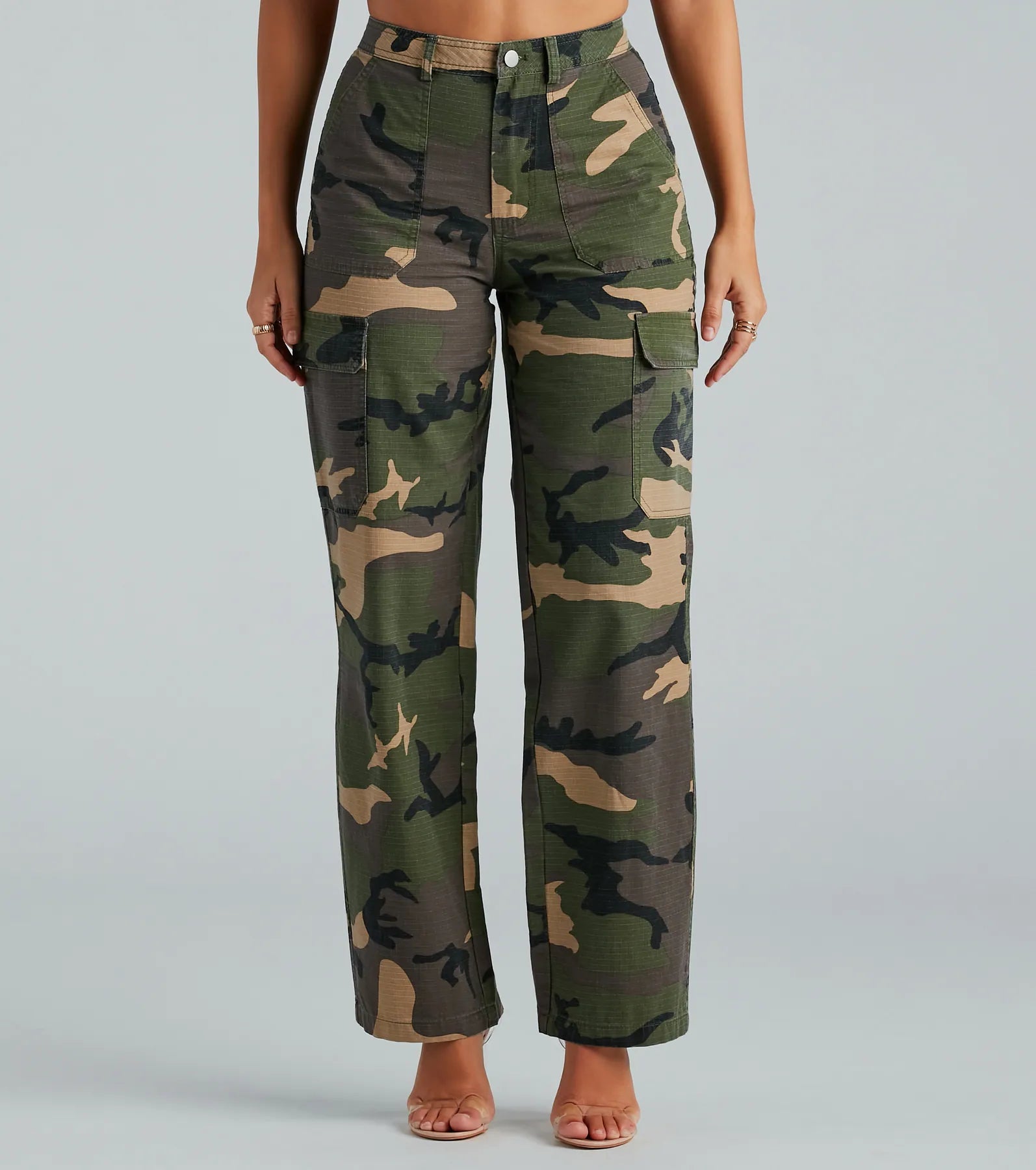 These camouflage pants play fair everywhere you wear them! Featuring a high-rise waist, a flattering wide-leg silhouette, cargo-style flap pockets, and a trendy camouflage print on woven fabric. Style the cargo pants with a basic bodysuit top and mules for a day out!