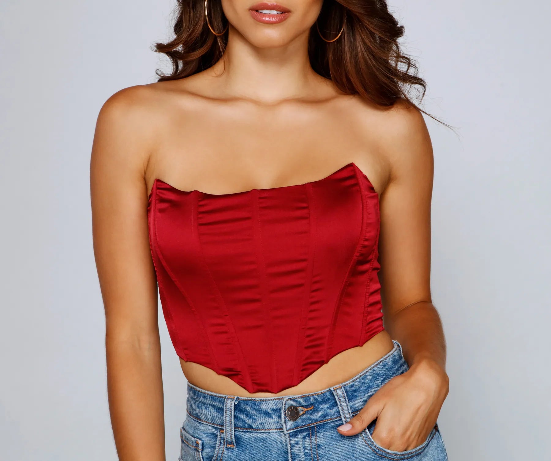 Sleek and strapless, this satin corset top is a must-have for elevating casual outfits! It features a square neckline with an angled design, flexible boning, back hook and eye closures, and a cropped, form-hugging fit. Style this corset with your fave pair of jeans and clear heels.