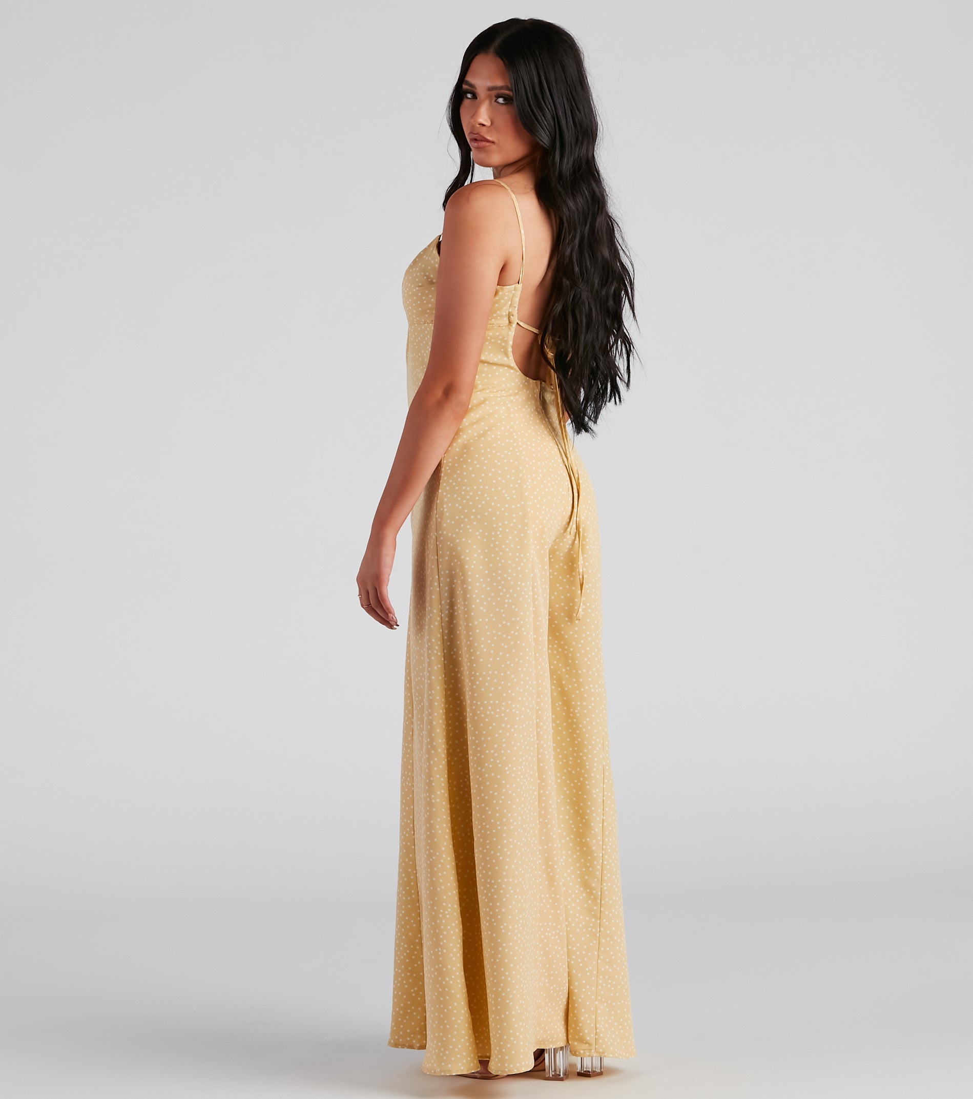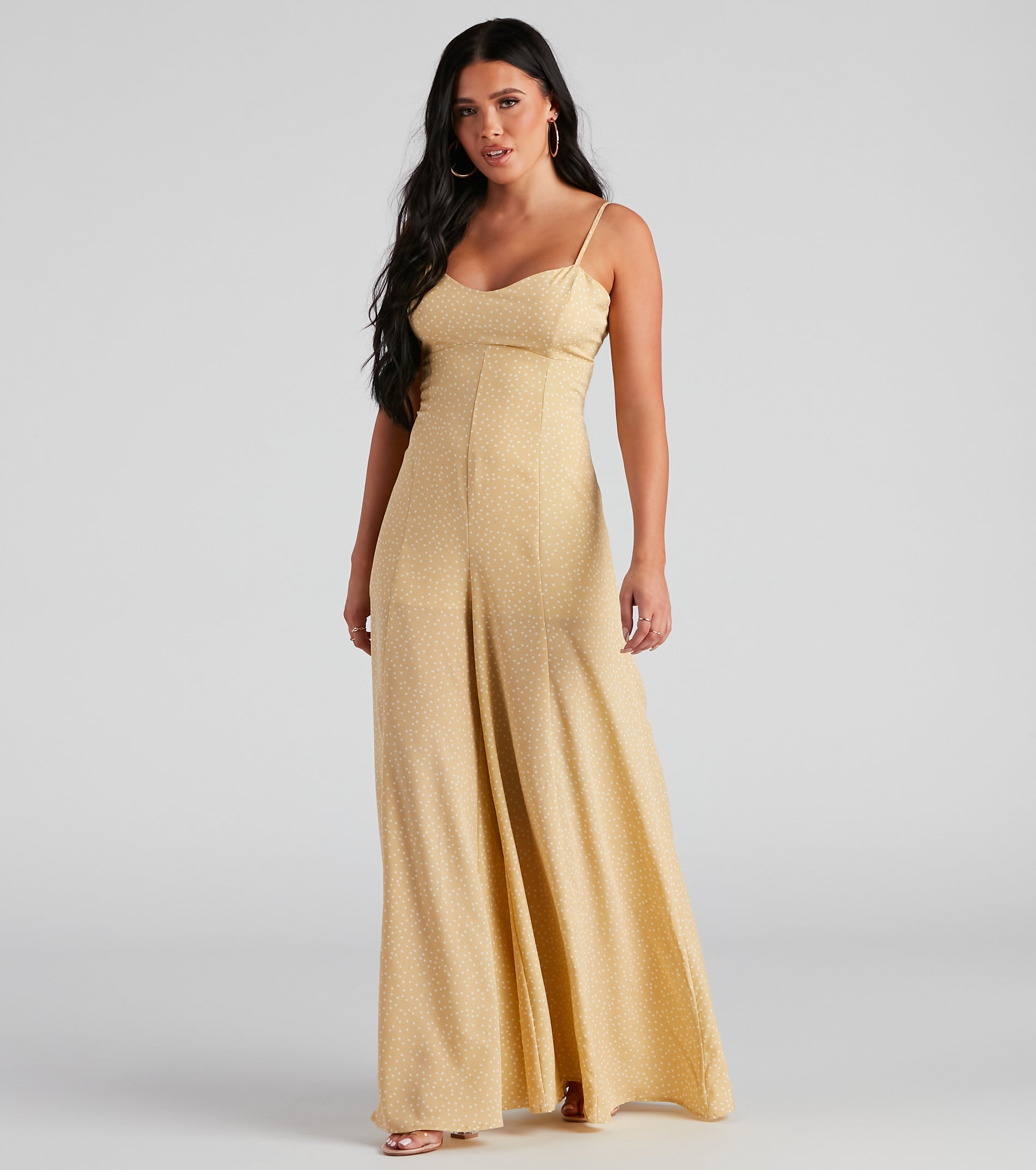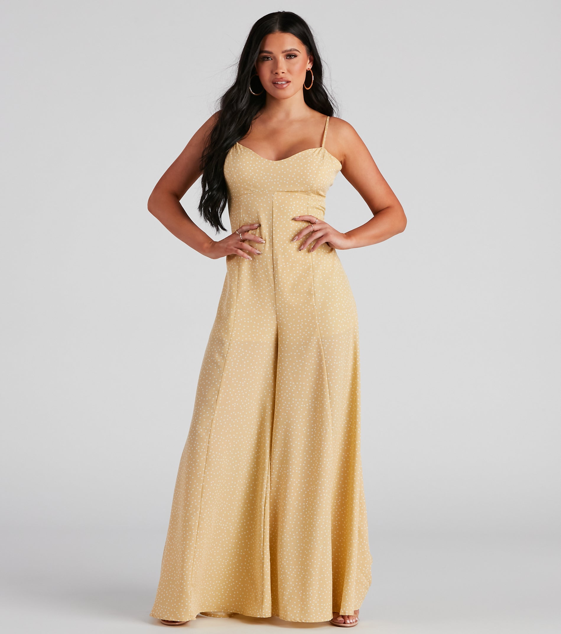 This breezy lightweight jumpsuit is perfect for casual summer days! It features a sleeveless V-neckline, spaghetti straps, a partially open back with an adjustable tie closure, and an on-trend, flowy, wide-leg fit. The airy woven fabric features an all-over adorable polka dot print. Complete the outfit with espadrille sandals.