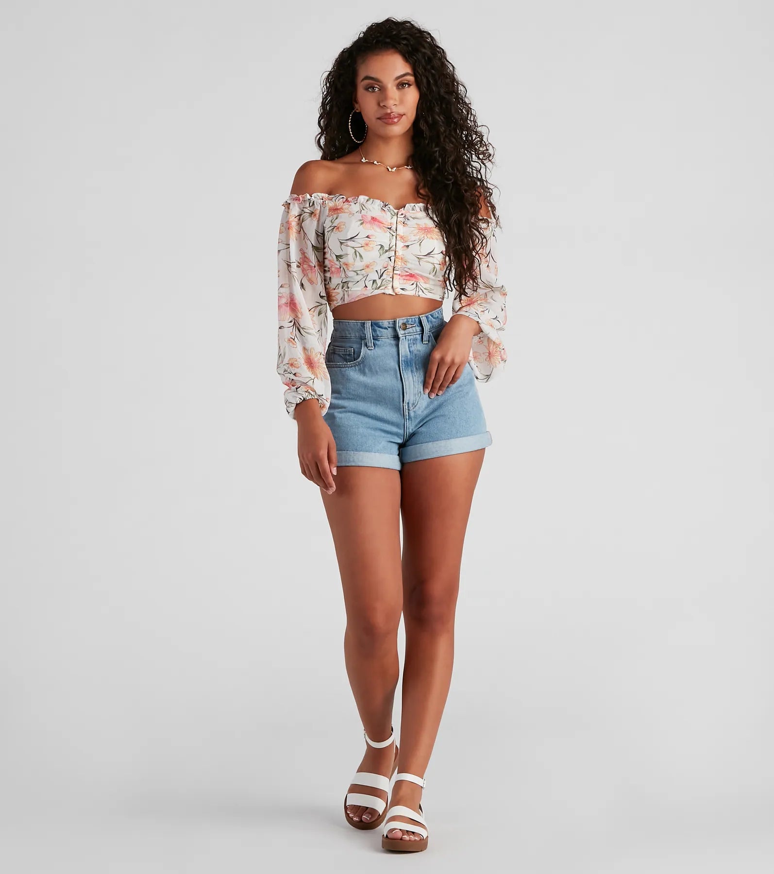 Brighten up your closet with this fresh floral chiffon top for spring! It features long peasant sleeves, a ruffled off-the-shoulder neckline, and front hook-eye closures that lead to a cropped hem. Complete the look in high-rise jeans and sandals.