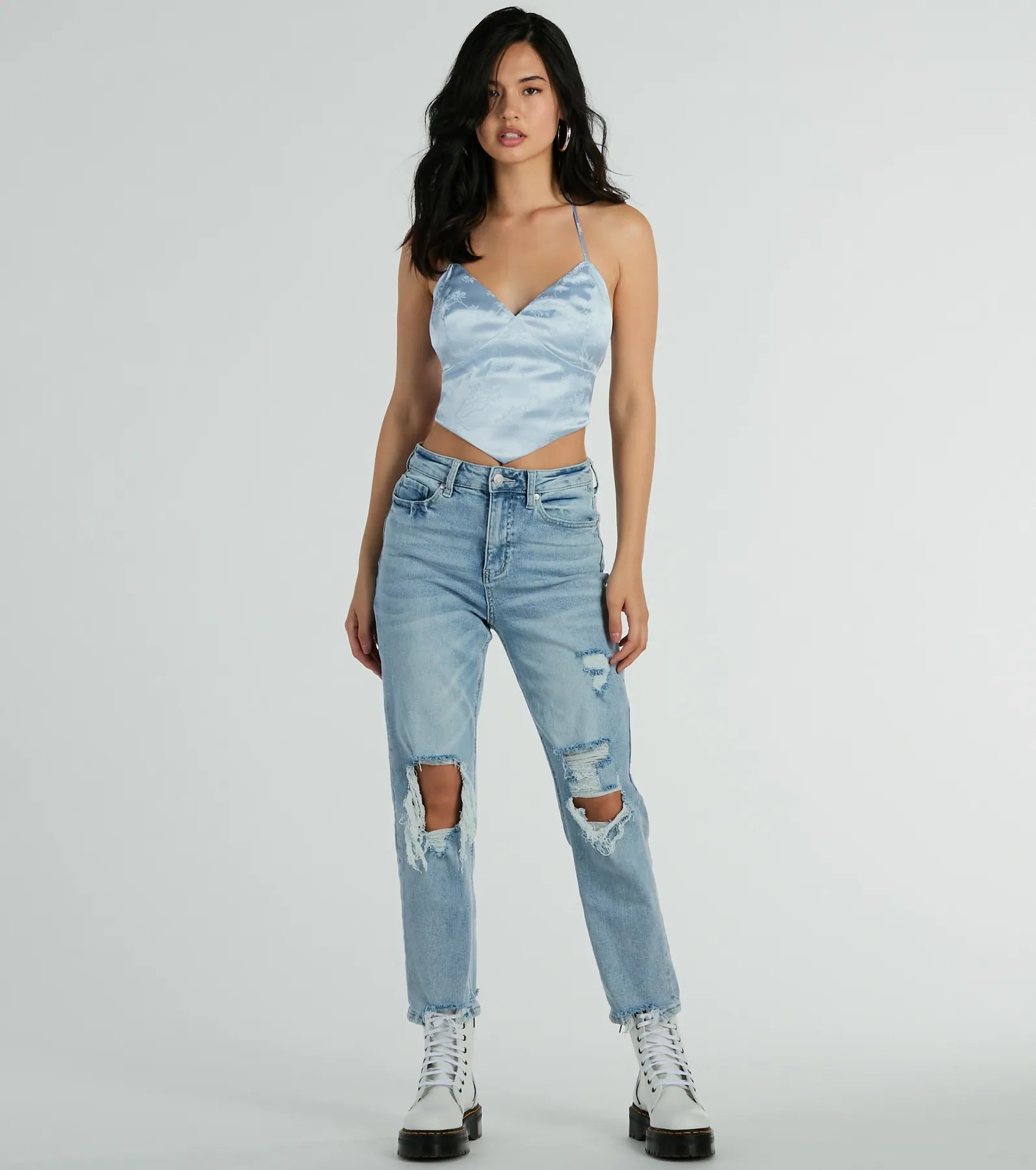 Indulge in the ultimate romantic effect in this halter tie-back floral satin top! Featuring a flattering V-neckline and delicate halter spaghetti straps, this top turns heads with its open tie-back closure. The fitted pointed hem and beautiful floral design on luxurious satin fabric make it a must-have for your wardrobe. Complete the look in high-rise jeans and mules.