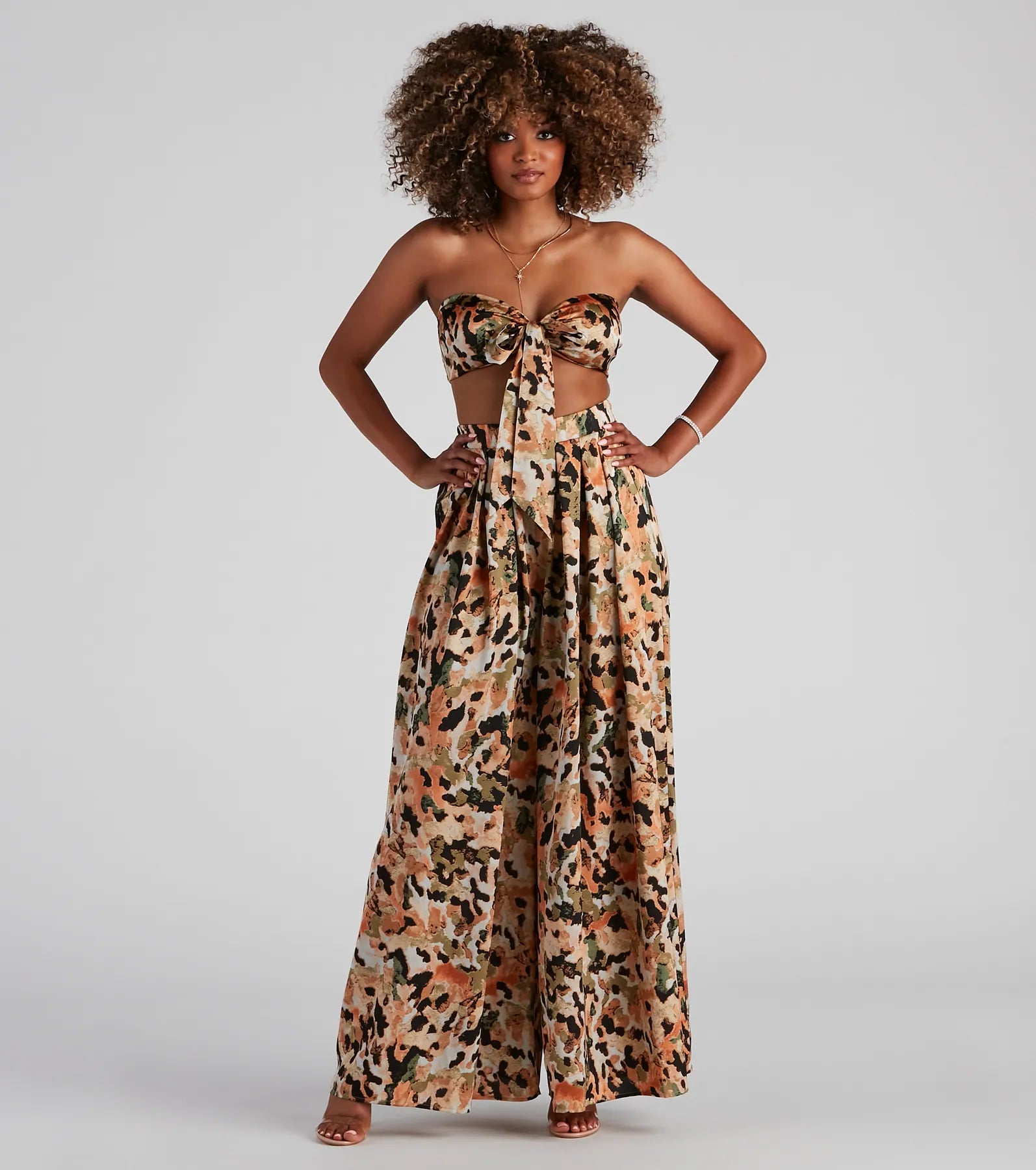 Abstract art you can wear! Slay an art gallery opening in this fierce satin crop top featuring a convertible design so you can style it multiple ways and a smocked back. Complete the look in the matching bottoms.