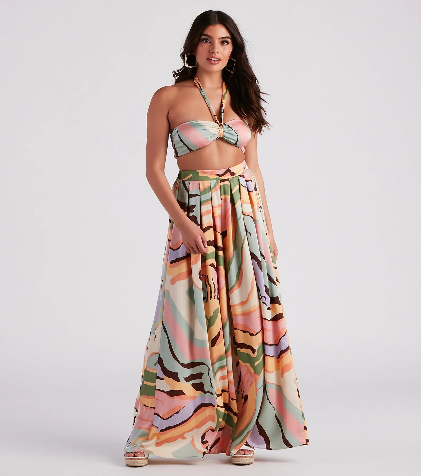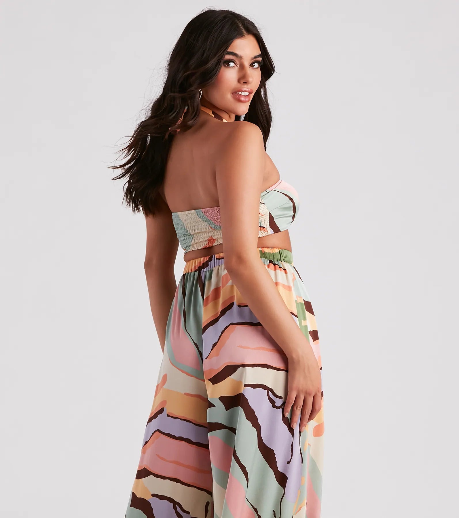 Bring the heat to your spring break look with this trendy crop top that will get everyone's attention! It features a sleeveless sweetheart neckline with a padded bust, thin halter straps with multiple ways to style, a stretchy smocked back, an ultra-cropped hem, and a sassy abstract printed design. Style with the matching wide-leg pants to be vacay-ready!