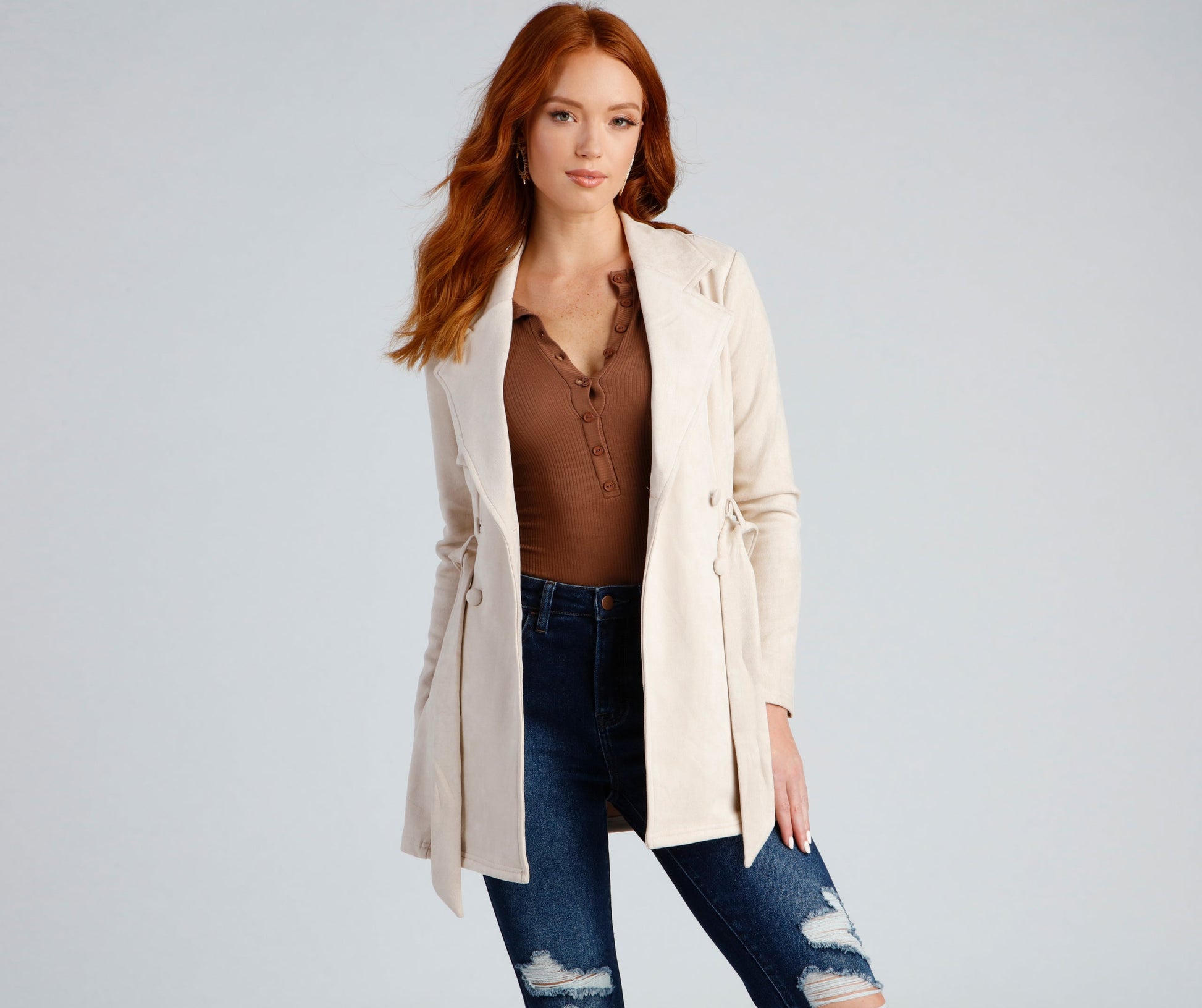 Layer on this chic faux suede trench for a classic and elevated vibe. It features a lapel collar, long sleeves, front button details, a cinching tie-front belt, and a short, fitted silhouette. Style this trench over a basic long sleeve top and dark wash jeans.