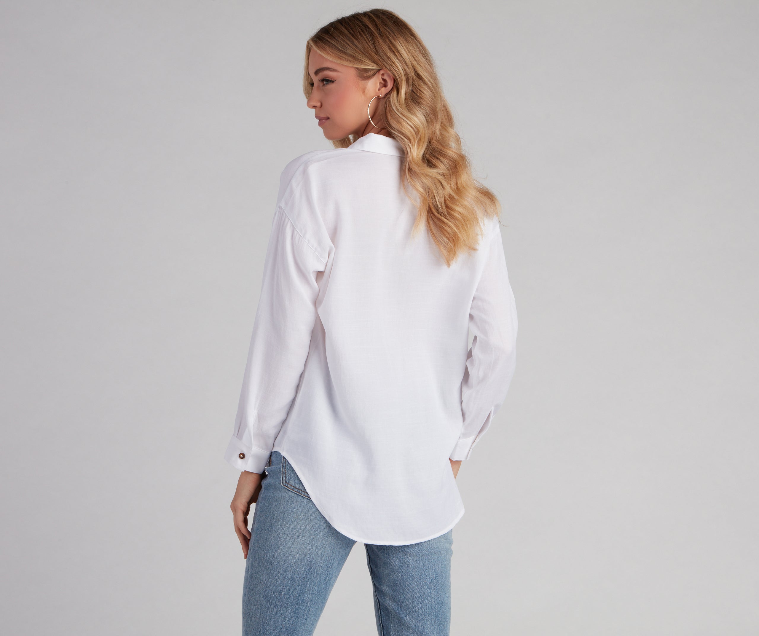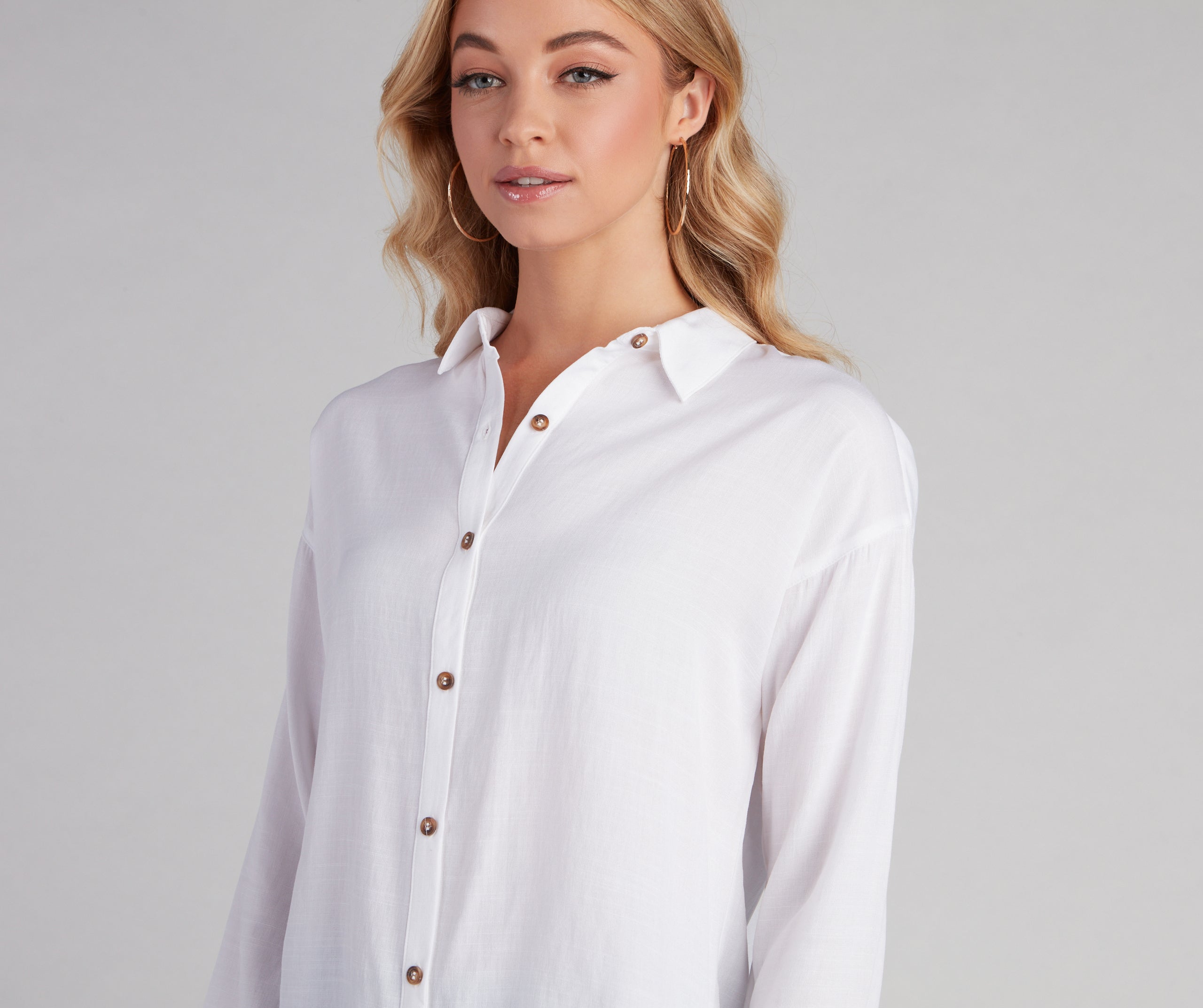 Everyone needs a classic button-down top in their closet! This lightweight linen top features a collared neckline with a complete button-down front, long sleeves, and a mid-length, relaxed fit. Style this top with a faux leather mini skirt and booties for an edgy vibe.