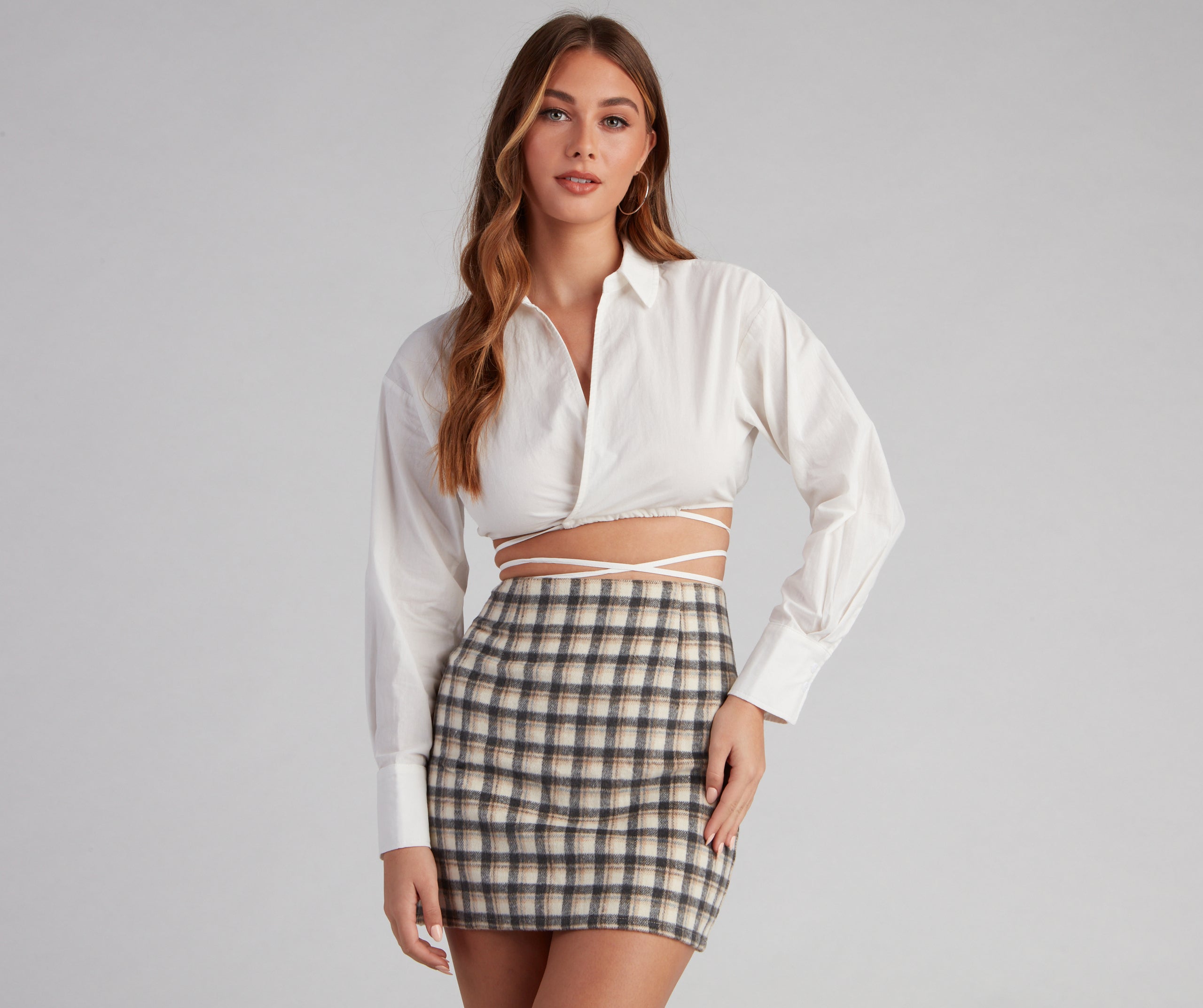 This collared crop top has elevated details that will make it a chic staple in your wardrobe. It features a collared V-neckline with a wrap-front design, long sleeves, and a cropped, form-hugging fit with a wrap-around strappy design at the waist. Pair this top with faux leather pants and clear mules.
