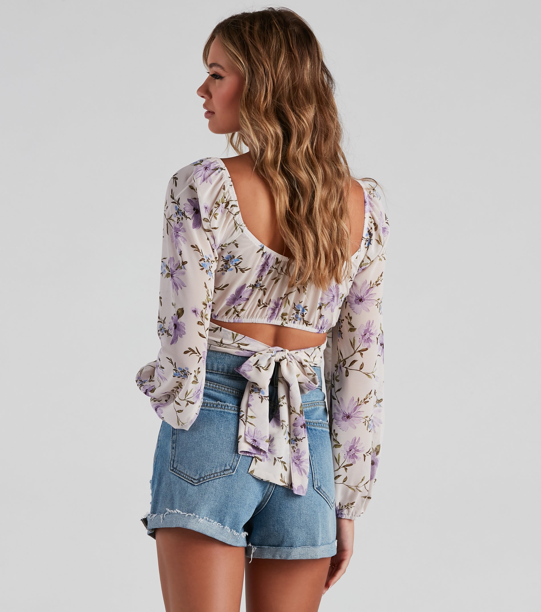 Fall for florals this spring! Create a cute look in this chiffon crop top featuring long peasant sleeves, a square neckline, and a cross-over hem with tie-back closure. Complete the look in denim shorts and knee-high boots.