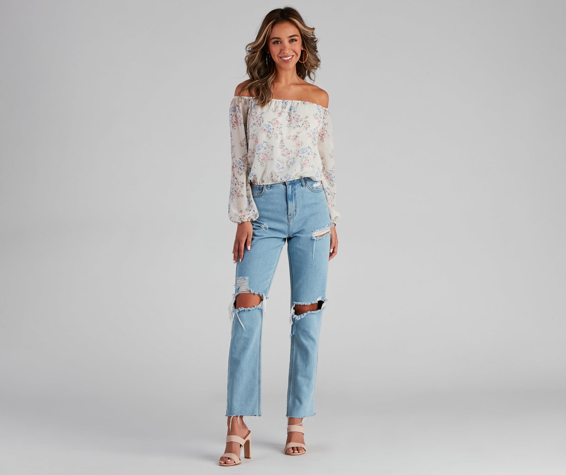 The prettiest bundle of flowers you'll ever see! Flaunt this floral off-the-shoulder blouse featuring long peasant sleeves and an elasticized hem on chiffon-lined fabric with no stretch. Complete the look in lucite mules.