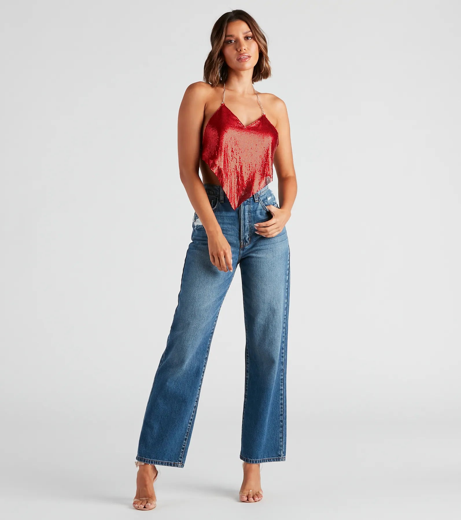 Make your fantasy come true and steal the spotlight in this glam chainmail crop top featuring a sleeveless, v-neckline with chain link halter strap, an open-back with chain link, and lobster clasp closure. Complete the look in a chic arm cuff.