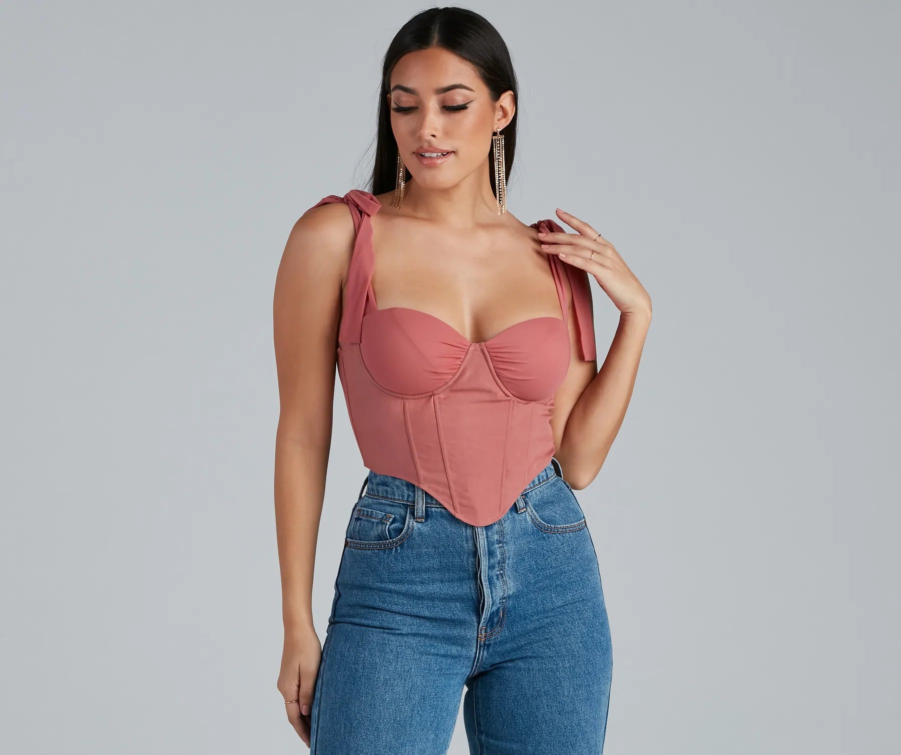 Sun's out, shoulders out! This cute corset top features a sleeveless bodice, tie shoulder straps, and a corset-style top with a built-in padded bust and back zipper closure. Complete the look in trendy boyfriend jeans and heels.