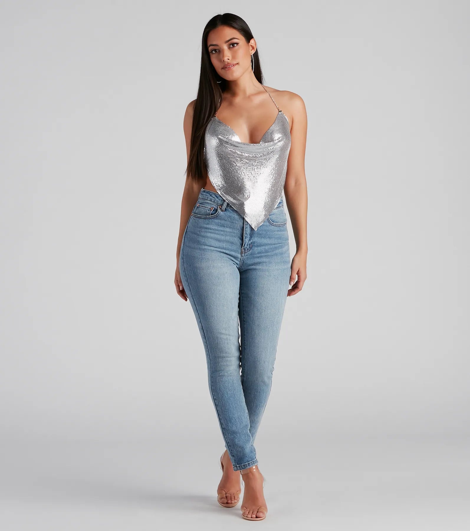 Girl stay on trend with a top that is everything! The top features a sleeveless cowl neckline, a chain-link neck strap with lobster clasp closure, a handkerchief-styled bodice, and a cropped hem. The top is composed of an unlined chainmail material that offers no stretch. Complete look with faux leather leggings.