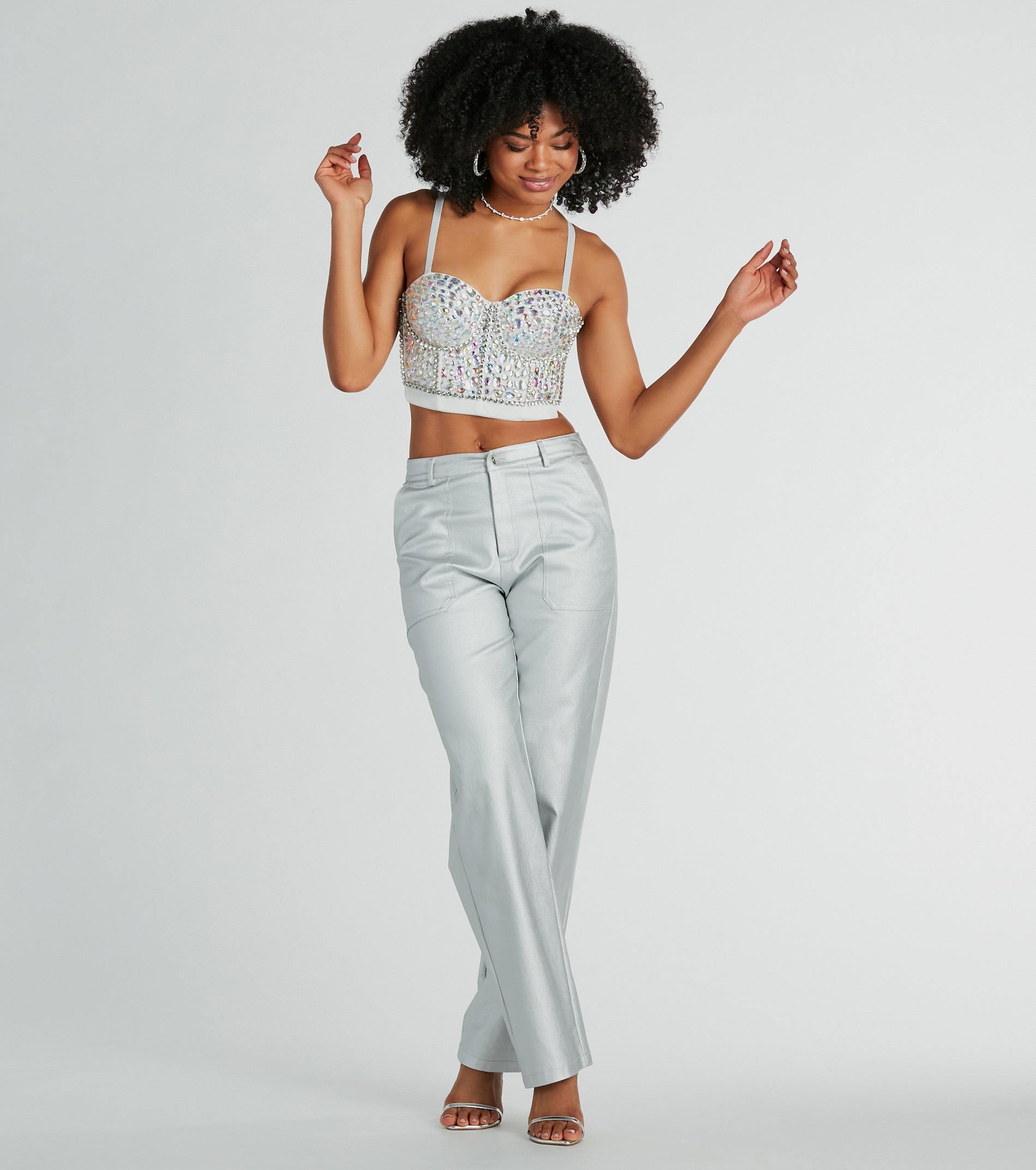 Bring magnificent glamour in this dazzling bustier top to parties and nights out! The sweetheart neckline with a padded bust and adjustable spaghetti straps offers a comfortable fit, while the rhinestone trim and large iridescent gemstones add a touch of glamour. The straps are also removable to make the bustier strapless! The structured silhouette and cropped hem enhance your figure, making you look and feel confident and chic! Complete the look in faux leather pants and heels.