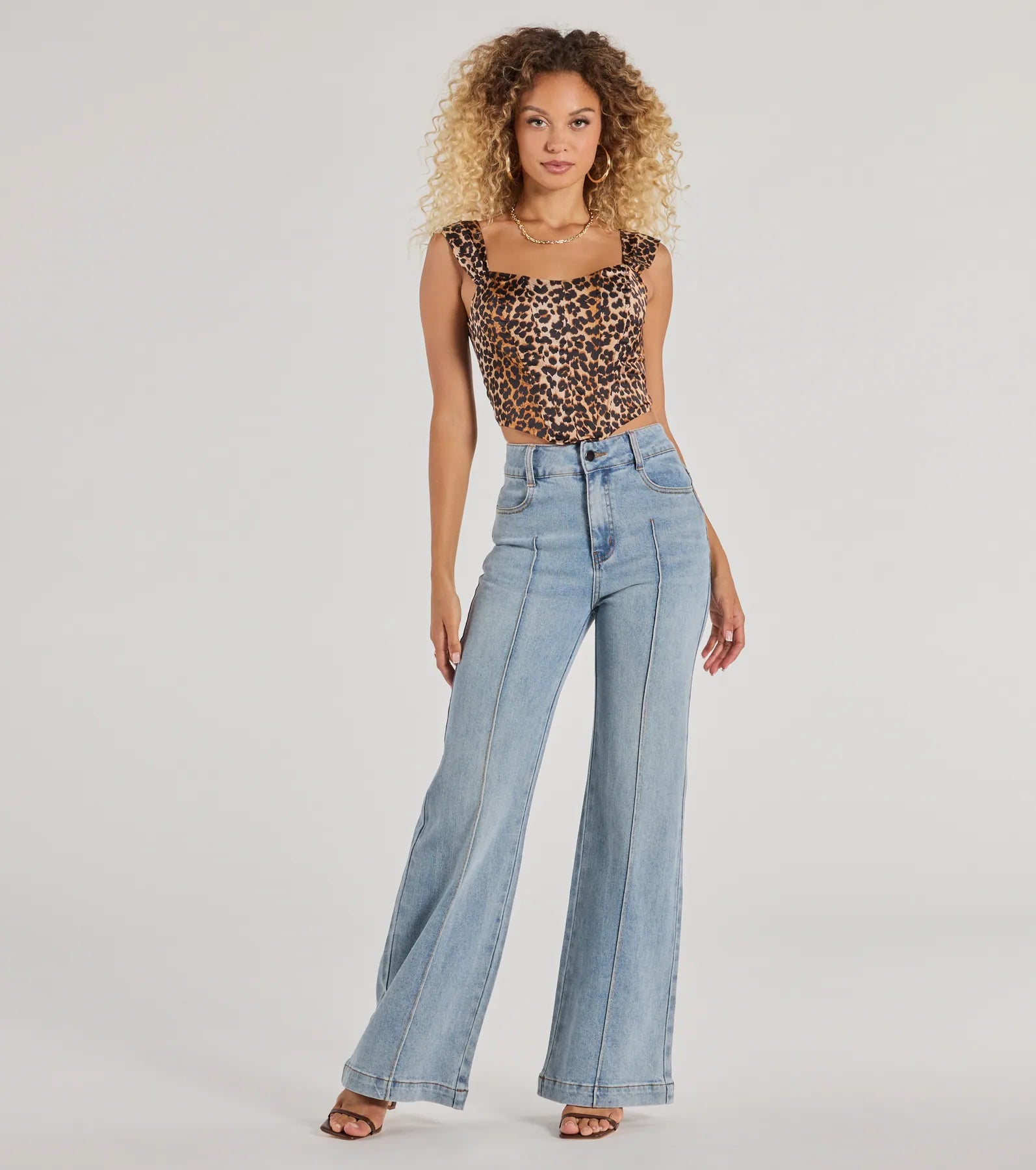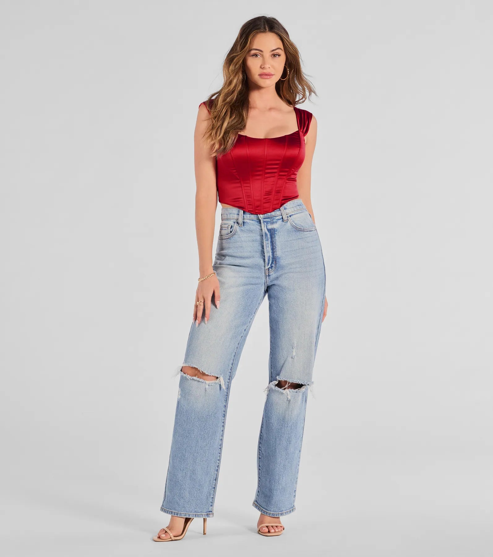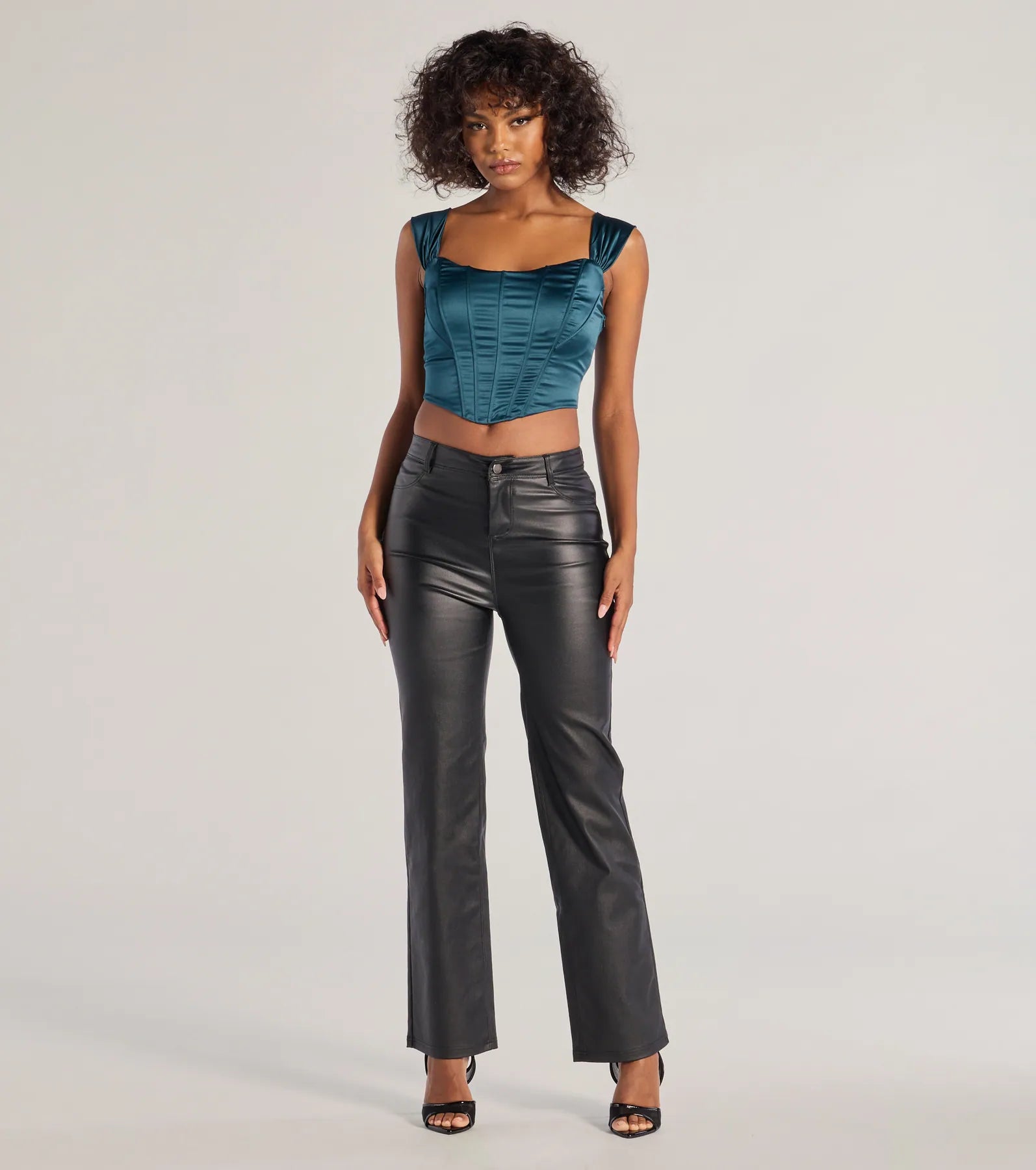 Transform into a captivating beauty in this satin corset top perfect for dressing up for parties or dates! The sleeveless square neckline and wide shoulder straps accentuate your figure, while the flexible boning provides support. The cropped hem and lace-up back add a touch of allure, all crafted from luxurious satin fabric. Complete the look in a sultry mini skirt.