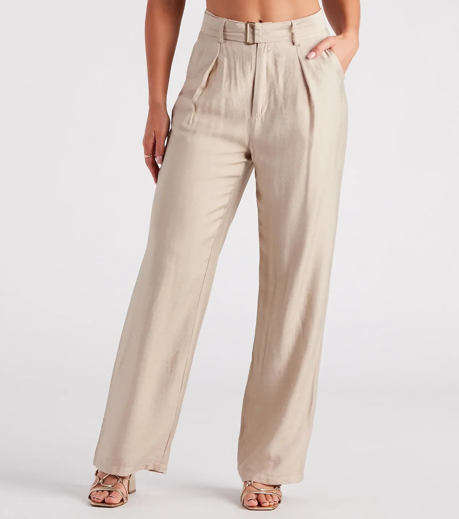 Show up in these stylish linen trouser pants to create an effortlessly chic look! They feature a high-rise belted waist, belt loop accents, hidden side pockets, and front pleating going down the wide-leg silhouette. The lightweight linen fabric includes a woven lining. Complete the outfit in strappy-heeled sandals?for a daytime casual soiree or a lunch date!