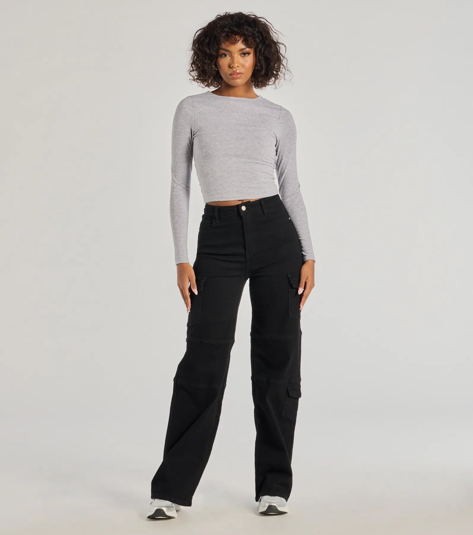 Get ready to rock these high-rise cargo pants. With a chic high-rise waist, belt loops, and cargo pockets, these pants are your go-to for effortless style and comfort.