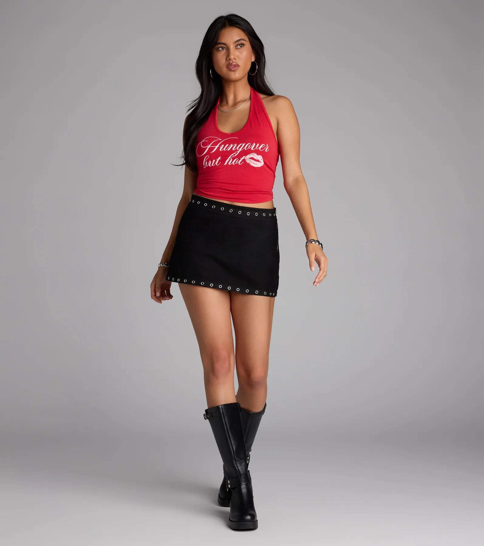 Warning: may cause double takes. This bodycon denim mini hugs you just right, with grommet trims that add a little rebel edge for your next concert or night out.